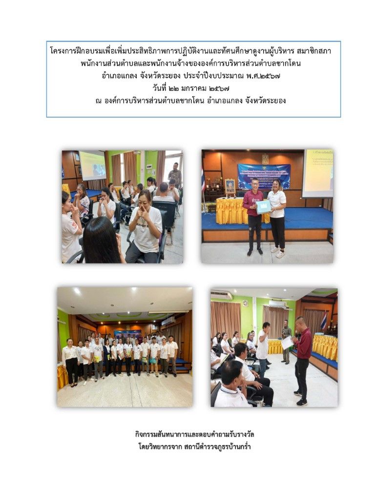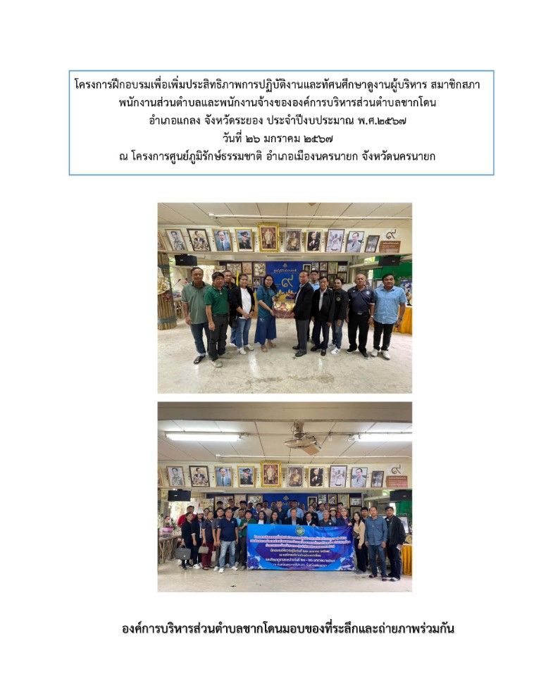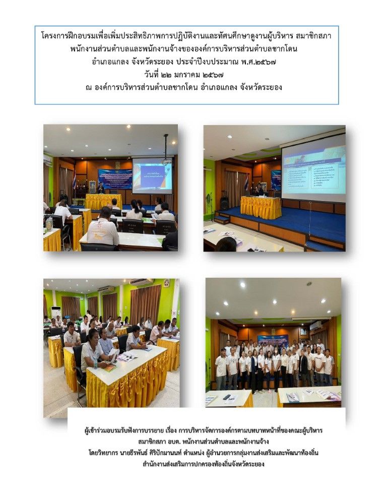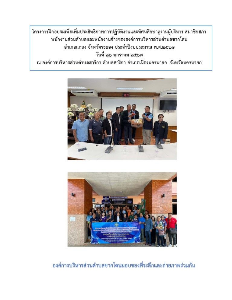 โครงการฝึกอบรมเพื่อเพิ่มประสิทธิภาพการปฏิบัติงานและทัศนศึกษาดูงานผู้บริหาร สมาชิกสภา พนักงานส่วนตำบลและพนักงานจ้าง ขององค์การบริหารส่วนตำบลชากโดน อำเภอแกลง จังหวัดระยอง ประจำปีงบประมาณ พ.ศ. 2567