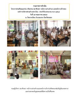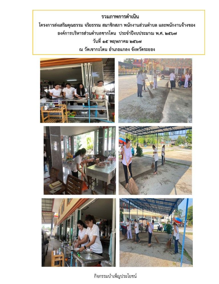 โครงการส่งเสริมคุณธรรม จริยธรรม สมาชิกสภา พนักงานส่วนตําบล และพนักงานจ้างของ องค์การบริหารส่วนตําบลชากโดน ประจําปีงบประมาณ พ.ศ. 2567 วันที่ 15 กรกฎาคม 2567 [ 20:03 น. ] เข้าชม 2 ครั้ง พิมพ์ ภาพกิจกรรม โครงการส่งเสริมคุณธรรม จริยธรรม สมาชิกสภา พนักงานส่วนตําบล และพนักงานจ้างของ องค์การบริหารส่วนตําบลชากโดน ประจําปีงบประมาณ พ.ศ. 2567 วัตถุประสงค์1. เพื่อให้ผู้บริหาร สมาชิกสภา อบต. พนักงานส่วนตำบล และพนักงานจ้างมีความเข้าใจในการปฏิบัติงานตามหลักศีล 52. เพื่อให้ผู้บริหาร สมาชิกสภา อบต. พนักงานส่วนตำบล และพนักงานจ้างมีทัศนคติของตนเองและต่อการทำงานบนหลักแห่งศีลธรรมคุณธรรม จริยธรรม และธรรมาภิบาล3. เพื่อให้ผู้บริหาร สมาชิกสภา อบต. พนักงานส่วนตำบล และพนักงานจ้างได้นำหลักธรรมทางศาสนาไปใช้การดำรงชีวิตประจำวันและใช้แก้ปัญหาที่เกิดขึ้นได้4. เพื่อให้ผู้บริหาร สมาชิกสภา อบต. พนักงานส่วนตำบล และพนักงานจ้าง เป็นแบบอย่างที่ดีในการเข้าวัดทำบุญ5. เพื่อให้ผู้บริหาร สมาชิกสภา อบต. พนักงานส่วนตำบล และพนักงานจ้าง ตระหนักถึงความสำคัญของคุณธรรมจริยธรรม โดยการลด ละ เลิก การทุจริตคอรัปชั่น และประพฤติมิชอบในหน้าที่เป้าหมาย ผู้บริหาร สมาชิกสภา อบต. พนักงานส่วนตำบล และพนักงานจ้าง อบต. จำนวนไม่น้อยกว่า 40 คนวิธีดำเนินการ1. ดำเนินการส่งเสริมการเข้าวัดทำบุญ การบำเพ็ญประโยชน์และนั่งปฏิบัติธรรม ระยะเวลาดำเนินการและสถานที่ดำเนินการวัดเขากะโดน วันที่ 15 พฤษภาคม 2567 อัลบั้มภาพ